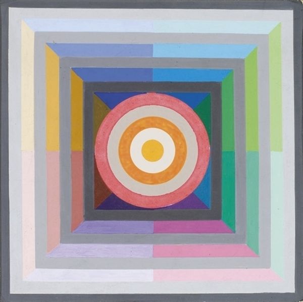 Curator: At first glance, it feels like peering into a strangely tiled abyss. There's an almost unsettling pull into its depths. Editor: We are currently observing Victor Vasarely’s "IGMAND," an acrylic on canvas completed in 1981. Vasarely, a leading figure in Op Art, masterfully manipulates geometric forms. Notice the way the checks diminish toward the painting's center point, creating an illusion of receding space. Curator: The chromatic range is fascinating, too. Why those particular hues, and what effect do they have, do you suppose? Editor: Well, if we examine the symbolic vocabulary that predominated in the 1980s, color functioned to dislocate objective readings, and stimulate subjective responses. Notice how color is deployed—to amplify spatial ambiguities—or deny spatial certainty. In this reading, Vasarely has composed his color as spatial device. Curator: So, if you were to follow this chromatic trail, how do these juxtapositions impact our experience, psychologically or emotionally? Is it purely about the geometry? Editor: I wouldn't dismiss the emotional dimensions. The interplay of colors, such as the soft lavenders next to the more assertive blues, could represent opposing energies held in dynamic tension. This echoes the psychological disorientation Op Art often provokes, unsettling the viewer's perception and prompting contemplation. Consider how the "IGMAND" elicits the sensation of movement, an interplay of advancement and recession. Curator: The longer I look at it, the more that receding void seems to morph into something architectural, like the corner of a very strange, very brightly colored room. Almost suffocating. Editor: Precisely, I read "IGMAND" as the paradox of modernity, representing the fusion of tradition and progress. Curator: Vasarely offers us a paradox within this canvas—an invitation to perceive, question, and ultimately, engage with the dynamic world around us. Editor: Absolutely, and a lasting question regarding the complex dialogue between the rational and the emotive within modern artistic expression.