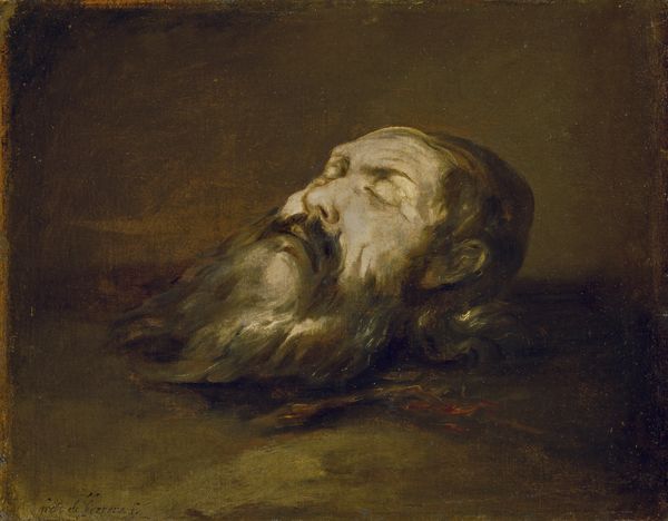 Editor: Here we have Konstantin Makovsky's "Emperor Alexander II on His Deathbed," painted in 1881. It’s oil on canvas and, wow, it's incredibly somber. What can you tell us about it? Curator: Well, consider the labor involved. Makovsky meticulously recreated Alexander II's likeness posthumously. The opulence of his uniform, painstakingly rendered, signifies the vast resources commanded by the Tsarist regime, built upon the exploitation of peasants. Don't you find the juxtaposition of imperial grandeur with the stark reality of death…pointed? Editor: It is striking. The uniform seems almost too bright, too detailed against the darkness. Is it meant to be critical of the Tsar? Curator: Perhaps. The application of the oil paint itself becomes a commentary. Think about it: pigment, derived from the earth, refined and manipulated through industrial processes, is used here to depict the very figure whose power stemmed from that same earth and its laborers. How can we divorce the artwork from its means of production? Editor: I hadn’t thought of it that way. So, you’re saying the painting isn't just a depiction, but an embodiment of the socio-economic forces at play? Curator: Precisely. And what does it tell us about the relationship between power, artistic creation, and ultimately, mortality? This is more than a simple portrait; it's a material testament to a complex web of power relations. Editor: This gives me a lot to consider. Thanks for pointing out what's under the painting's surface. Curator: My pleasure. It's vital we examine not just what art *is,* but *how* it is made and the stories of those whose hands brought it to life.