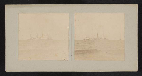 Editor: We’re looking at “Duitse marineschepen voor de haven van Kiel,” or “German naval ships off the port of Kiel,” a photograph taken sometime between 1903 and 1910 by Geldolph Adriaan Kessler. It's held here at the Rijksmuseum. I’m immediately struck by how...vulnerable the ships look in the vastness of the sea. The tones are muted, almost ghostly. What’s your take? Curator: Vulnerable is an interesting choice, it resonates with me. I think this image, beyond just documenting naval power, hints at the uncertainty of the era. This photograph appears to be a stereograph, meant to create a 3D image when viewed through a special device. Do you think the intended viewing experience shifts the mood at all? Editor: I imagine that bringing that 3D element could add a sense of ominous scale and heighten that vulnerability! Does the Realism tag fit here, or is there something else happening with the aesthetic? Curator: It is labelled Realism, of course, striving to capture a scene objectively. But I think it hints at something more – perhaps a commentary on the fleeting nature of power, or maybe even a premonition of the conflicts that were brewing in Europe at the time. The grainy texture lends a dreamlike quality. What emotional impact does that have on you? Editor: The graininess does blur the line between reality and something more… ethereal, unsettling. So maybe Realism is only *part* of the story here. It makes me wonder what Kessler's intentions were – just a record, or something else? Curator: Precisely. And perhaps intentions don't even matter so much as the emotional echoes that vibrate through the decades. What lingering question does it leave you with? Editor: It leaves me thinking about the human cost, often unseen, behind these displays of military might. Thanks! Curator: Absolutely, it makes me think about all the stories art can tell, beyond the surface, that touch the deep chords of shared experience. A real ocean of emotion, eh?