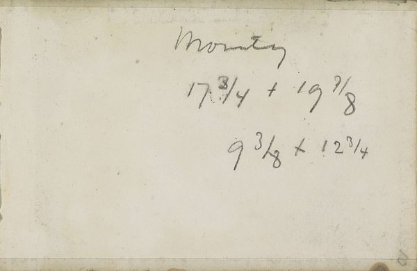 Curator: Here we have “Annotaties,” or "Annotations," a work by Isaac Israels dating from 1875 to 1934. It's part of the collection here at the Rijksmuseum. What are your first thoughts on this piece? Editor: The delicate hand-lettering jumps out. It feels like a quiet, personal inscription, more a note to oneself than something intended for public view. I’m immediately curious about the kind of ink or pencil he used—what material gives it that subtle, almost faded quality? Curator: Considering Israels's background, moving in circles that promoted modernism in Amsterdam and influenced by Impressionism in Paris and London, it's intriguing to see him working in this way. The act of sketching typography seems a rather deliberate move away from traditional notions of painting displayed in salons and institutions. Editor: Precisely. It reminds us that so much artistic labour goes unseen, happening in studios and sketchbooks, away from formal exhibition spaces. Were these annotations intended to be preparatory studies? Were they material explorations in their own right, with a tangible function outside of being high art? The tension interests me. Curator: It's easy to forget the sheer volume of 'invisible' artistic work when we're confronted by completed masterpieces. Think of the societal context! Isaac Israels had an aristocratic upbringing. Reflecting upon the era of Israels gives context to these informal experiments as private pursuits permitted by privileged circumstance. Editor: That contrast of context makes it all the more compelling. These “Annotations”, scribbled in what looks like pencil on simple paper, seem at once fleeting and important. They are intimate and personal yet could later form the basis of larger societal narratives and more monumental works. They are the physical remnants of the daily artistic process that led to those stories being created. Curator: Absolutely. The work also speaks to the burgeoning accessibility of art materials during that period, and how this changed not just art creation, but, moreover, the business behind it. Israels lived through huge societal shifts, which saw him reflect on old modes of artistry to new markets, a radical disruption to older forms of commissioning work that had, until recently, governed artists and patrons for centuries. Editor: Thanks to works such as this one we get to have those perspectives. For me, “Annotaties” encourages one to appreciate both process and finished result as well as everything in-between. Curator: Yes, it definitely humanizes him. A peek into the thoughts of an acclaimed painter who, for the better part of his life, stood in contrast to previous systems in favor of creating one's own business, while at the same time engaging directly with it.