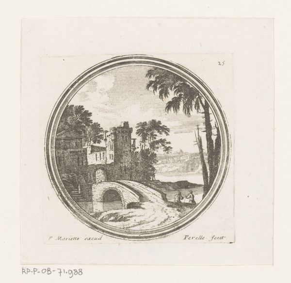Editor: Here we have Nicolas Perelle's "Gezicht op stadspoort," an etching, dating from 1613 to 1695, held at the Rijksmuseum. The circular composition is quite striking; how would you interpret this work, considering its formal elements? Curator: Observe the carefully delineated structures—the tower, the arch, the distant hills. Note the contrast in textures achieved through line variation. How does Perelle utilize hatching and cross-hatching to suggest depth and mass within the strictly bounded circular format? Editor: It's almost like a miniature world contained within that circle. And I notice the linear perspective, guiding the eye deeper into the scene. Curator: Precisely. Consider the placement of the tower, slightly off-center. It generates a visual tension, doesn't it? The viewer's gaze is pulled from the detailed foreground toward the implied vastness beyond. Do you find the overall structure contributes to a sense of balance, despite its asymmetry? Editor: Yes, actually, I see how the heaviness of the architectural forms is counterbalanced by the lighter, more open area with the sky and the distant mountains. What about the figures? They seem almost incidental. Curator: Are they truly incidental? Reflect on their placement and scale in relation to the architecture. They offer a sense of human presence and a suggestion of scale, enhancing the monumentality of the structures. It could be argued that the tension between minute detail and monumental scale informs the entirety of the etching. Editor: I hadn’t considered their importance in that way. I focused mostly on the buildings, the lines. Curator: But understanding how the elements relate is key. Editor: True, looking at it purely from a structural point of view, noticing these details becomes incredibly enriching. Curator: Indeed, seeing art as structure allows us to understand visual hierarchy, tension, balance, and appreciate the artistry within its intrinsic form.