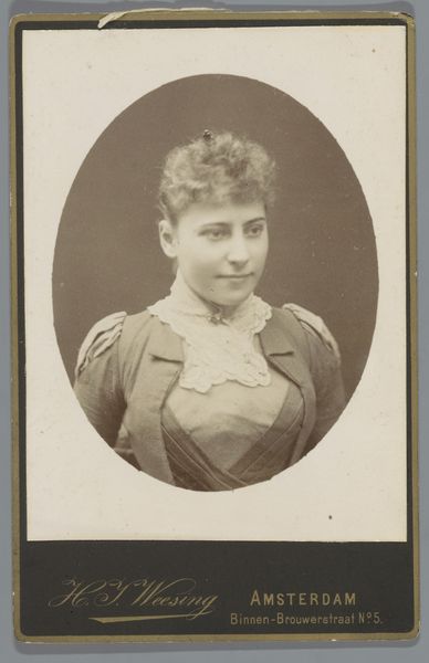 Editor: Here we have "Portret van Charlotte van Braam," a gelatin silver print photograph taken sometime between 1887 and 1898, housed in the Rijksmuseum. I'm struck by the textural contrast – the smooth face versus the detailed frills of the dress. What stands out to you? Curator: I'm drawn to the photographer's management of light. Notice how the tonal range creates form, subtly articulating the subject's face and gown. It isn't necessarily what's represented but the formal properties. Editor: The composition feels very traditional for a portrait. Is that an intentional choice, do you think? Curator: Precisely! The stable, centered composition and controlled tonality create an aesthetic harmony. The placement of the figure directs the eye systematically – from the top of the image where the dark feathers create height, down across the soft shoulders, towards the darker embellishments and shadow along her garment. Editor: It's interesting how such limited tonal range can still be so descriptive. The puffiness of the sleeves, for example. Curator: Indeed. The formal elements interact, creating meaning not reliant on the specific identity or context outside the image itself. This manipulation of form elevates a simple photographic portrait. What would you say is most successful element formally? Editor: Maybe the economy of detail; the textures are suggested rather than literally rendered. I’ll be more aware of the use of tone and form. Curator: A powerful combination in this case! We discover how careful structuring provides depth within a constrained medium.
