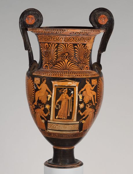 Curator: What strikes me immediately is the incredible liveliness depicted on this ancient Greek vase! There's a real energy to it, a sense of revelry or even drama unfolding. Editor: Indeed. The Metropolitan Museum of Art houses this Terracotta volute-krater, dating back to around 330 BC. Volute-kraters were large mixing bowls, typically used for diluting wine at symposiums or banquets. The craftsmanship of this piece is exceptional, using the red-figure pottery style characteristic of the period. Curator: Red-figure… right. The figures practically glow against the black background. I am really fascinated by how clear they are despite everything— I guess wine and other ingredients splashed about over the centuries? Tell me more about what these scenes meant back then. Editor: The iconography adorning this krater offers insight into ancient Greek beliefs and customs. We see mythological figures, possibly engaged in some kind of ritual. Note the attention to detail in their gestures, clothing, and attributes. The scenes are like visual shorthand for complex narratives— familiar to its original audience, though open to interpretation today. Even the decorative patterns running around the rim and handles aren't merely aesthetic; they function as symbolic borders framing the central images. Curator: That’s right—borders, both aesthetically pleasing, psychologically containing. It makes one wonder who might be depicted there, considering how the symbols work to separate each narrative thread from daily life. But do we even know the purpose of these objects other than decoration? Editor: The krater was crafted to both impress and engage. Imagine the conversations these images sparked, the stories retold as guests gathered around, drinking wine. Even the faces applied as relief ornaments on the handles suggest a deliberate intention to provoke dialogue. I love how these ancient craftsmen used earthenware to tell layered stories, binding together history, myth, and aesthetics. Curator: Looking at it, I now can't help but wonder how it sounds, even silently… picturing it on display within a home or a public area... In its own way, the design reflects aspects of cultural continuity— a material conversation still unfolding across centuries, as it still asks the same question... a testament to the deep human urge to explore the unknown through beauty and reflection. Editor: Exactly. And perhaps that is precisely why this piece continues to enchant viewers today.