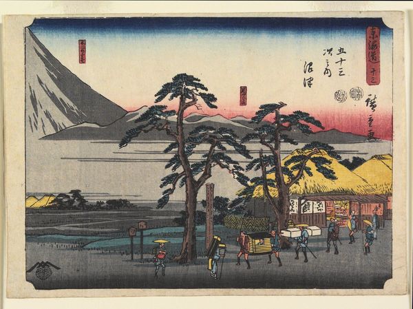 Curator: This tranquil woodblock print, “Kameyama,” was created by Utagawa Hiroshige sometime between 1840 and 1842. You can currently find it here at the Minneapolis Institute of Art. Editor: The muted colours create a calm, almost melancholy feeling. It reminds me of a watercolour painting, despite the clear lines of the print. It's so visually quiet. Curator: The scene captures travellers along the Tokaido Road, which connected Edo, modern-day Tokyo, with Kyoto. Woodblock prints of this nature weren’t just picturesque postcards, they also fulfilled a demand for accessible art during a period of economic and cultural flourishing. They held tremendous appeal. Editor: Look at those travelers! You see their small hats, little bursts of pale gold punctuating the muted landscape, like prayers ascending. Curator: That's a beautiful image. Consider how these roadside scenes allowed viewers, particularly urban dwellers, to vicariously experience a journey. Beyond simple landscape depiction, you could almost read the image as a spiritual journey, considering Shinto and Buddhist elements integrated into Japanese life at this time. The distant mountain… Editor: It really anchors everything, doesn’t it? The whole scene feels directed toward this distant mountain and palace… which perhaps hints at larger themes of pilgrimage. Almost makes the human travelers into ants. Curator: The use of perspective draws the viewer into the scene. Hiroshige, like many artists of the Ukiyo-e tradition, masterfully combined traditional Japanese aesthetics with influences of Western art to achieve this kind of depth and realism. The way it collapses foreground and background space... brilliant. Editor: It almost feels staged, with these deliberate groupings of travellers leading our eye. Curator: Exactly. The landscape isn't just scenery, it's also a carefully arranged stage. To consider that today as the intersection of history, landscape, cultural memory is profound. Editor: Right, a constructed world meant for mass consumption! I see the people now, more as symbolic echoes of our own transient journeys, each little hat just another prayer floating upward. What a lovely bit of social commentary on time, transition and place!