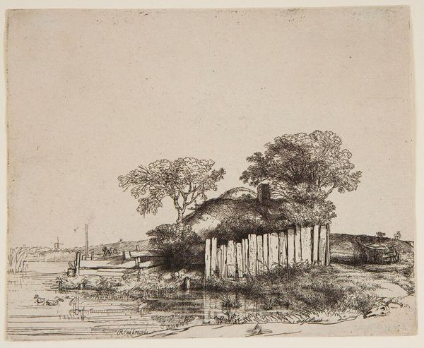 Curator: Right, let’s take a look at this little gem. We have before us Rembrandt van Rijn’s etching, “A Cottage with White Pales,” created in 1642. It's a small print, just a few inches in each dimension, made using etching techniques. Editor: Immediately, what strikes me is its stillness. There's a real quietude about it. The simple cottage, nestled between the trees... it feels like a place you could just breathe. Curator: Yes, Rembrandt returns time and again to images of farmhouses. This, however, shows how carefully chosen rural imagery could contribute to the creation of Dutch national identity at a time of emerging nationhood. The cottage imagery seems carefully planned here to promote ideas about a stable and sustainable existence. Editor: It’s funny you mention planning, because when I look at it I just think, nature. Rembrandt has this wonderful ability to suggest immense detail with the lightest touch. The way he captures the texture of the trees, the reflection in the water – it’s like he’s transcribed a living, breathing scene. The very dark marks contrasted with empty paper sections create the illusion that the air vibrates above the land. Curator: And that "lightness of touch", as you put it, allows us to see into the lives of ordinary people within the drama of socio-economic transformation. Through prints such as this one, his etching process was accessible to more people than ever. He's building a shared cultural vocabulary. It's art, but it's also a powerful tool for communication. Editor: I guess what resonates for me is that this work offers a reminder that there's a unique beauty to be found in ordinary things. Something simple, something very close. And the scale of the print, really makes the view a privilege to the beholder. The detail rewards extended scrutiny. It makes you think, what if I lived there? What would I be doing right now? Curator: I’m struck again by the radical notion that we have in front of us not simply art for art's sake, but a visual form that also acts a record of national ideas, values and ways of life. Editor: Well, it’s interesting how it pulls us in different directions! But ultimately, it’s a simple yet potent image that reminds us about looking closer to the familiar elements in our lives. Curator: A vital contribution to national conversations about identity and stability.