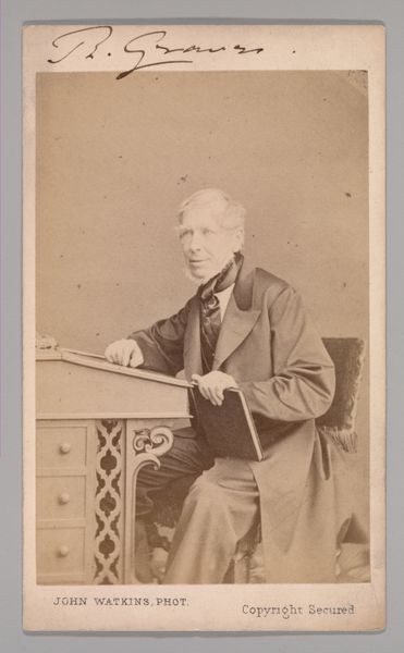 Curator: Alphonse Le Blondel’s gelatin silver print, dating roughly from 1865 to 1875, presents a solemn, unidentified old man. Editor: What strikes me first is the photograph's tonal range. It’s almost entirely muted, a sea of grey that suggests an overwhelming melancholy. The sitter’s gaze, those heavy eyes, seem to embody the same somber quality. Curator: Absolutely, that monochromatic palette informs everything. Le Blondel masterfully controls the light to reveal the sitter’s age. Note the delicate balance achieved in the fall of light and shade: how the subtle modelling coaxes out textural detail in the face. Editor: I can't help but focus on the placement of the hat. Positioned to the side on the table, a little behind the man: it stands as a poignant reminder of status, maybe a life's ambition or career now set to the periphery. It whispers of time’s passage and of forgotten selves. Curator: And the way the figure is spatially situated; observe how he fills the frame, solidifying a central, anchored form that speaks of tangible reality and physical presence. His materiality is amplified through his clothing - he wears the trappings of social standing. Editor: Yes, and consider the subtle power the photographer extracts from the image with such subtle realism; not only does it preserve an image of this particular man, but stands as a potent symbol of the elderly male during the nineteenth century. A portrait embodying both personal identity and universal experience. Curator: Le Blondel’s skill encourages prolonged, detailed examination, a quiet invitation into an investigation of pictorial and physical form. Editor: I'm leaving this image thinking about how such an ostensibly simple, realistic portrait resonates beyond its original setting and context. The weight of the image feels strangely moving; there's so much humanity there in that quiet image.