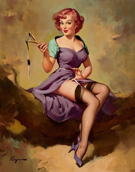 Curator: Edward Runci’s painting "Redhead with Black Negligee" is a striking example of figuration through the medium of oil paint, falling loosely into academic-art portrait style and a common theme of Runci's oeuvre: the nude. Editor: Oh, she’s luminous! A modern-day Venus rising, all that red hair against the darkness of her gown. It's a kind of invitation, isn't it? Like, "Come closer, darling." Curator: I think Runci captures the ways gender and commerce intertwine. Note how the sheer negligee, undoubtedly a mass-produced commodity, signifies both allure and the artist’s awareness of objectification within visual culture. Her body is presented, yes, but think of how the material is deployed here as almost armour. Editor: Armour... I like that! It makes me think of old Hollywood glamour shots. All soft focus and deliberate posing, and isn't that what we want sometimes, that constructed idea of perfection, that shield? But even though Runci's working in oil, the light, those gradients of shadow feel delicate. Curator: Precisely. Oil allowed Runci the plasticity to construct complex light effects that simulate sensuality. Also, his method probably involved multiple preparatory sketches, typical for that pin-up illustration style and art production lineage that became commercialized later. Editor: Commercialized…but personal, too? The glint in her eye, that smirk; those aren’t mass produced. It’s got to be, some projection or a captured mood he responded to. A spark from subject to artist… Curator: Certainly. There is intentionality, especially regarding production: Runci’s studio practices would emphasize skilled handwork while relying upon prevalent gender expectations. Even so, let us remember that the creation and distribution also depends on labour arrangements typical of that kind of creative production at mid-century. Editor: Okay, so it’s like a collaborative ghost dance: us, the subject, Runci and the cultural spirits that haunt this whole image! Seeing all these possible meanings woven together... it brings her, it brings them, even more vividly to life. Curator: An excellent summation! Considering art and its material context indeed can reveal nuanced depths within such cultural artifacts.