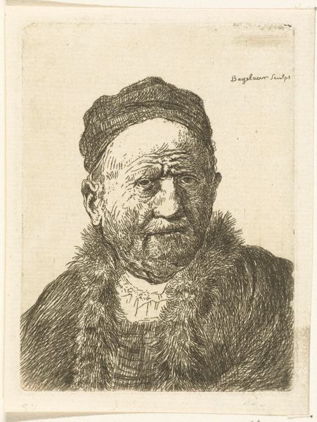 This small etching by Ernst Willem Jan Bagelaar, dating from the late 18th or early 19th century, depicts a man believed to be Rembrandt's father. The image is brought into being via the chemical erosion of a metal plate, a painstaking process involving acid and careful control. Look closely, and you'll see the network of fine lines. The artist would have strategically etched these into the metal, building up tone and texture. Notice how the density of the lines creates the shadows and contours of the man's face and clothing. Etching, like engraving, was a reproductive technology; it allowed images to be disseminated widely and relatively cheaply. This print, in its modest way, speaks to the rise of a visual culture driven by commerce, enabling artists like Bagelaar to circulate their work and ideas, and for collectors to acquire them. Consider the labor involved in the production process, from the preparation of the plate to the printing of each impression. Ultimately, appreciating this etching involves understanding its historical context, and the relationship between artistic skill, material processes, and broader social forces.