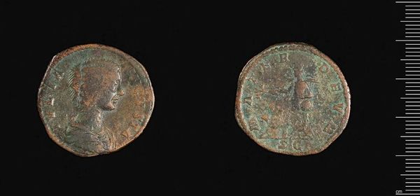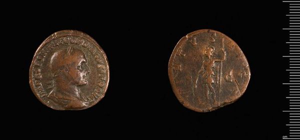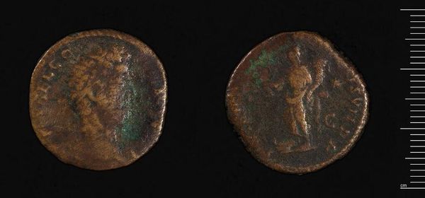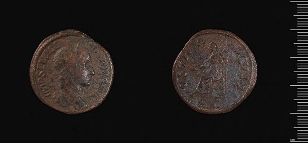 Curator: Here we have a Sestertius of Severus Alexander, residing here at the Harvard Art Museums. Its weight is approximately 21.46 grams. Editor: It’s intriguing, isn't it? There’s a quiet gravitas to the profile, even though it is worn. The weight in the hand… a tangible connection to the emperor. Curator: Indeed. The Sestertius, particularly under Severus Alexander, circulated widely. It wasn't merely currency; it was a tool of imperial propaganda. These images of the emperor were vital in projecting power. Editor: The seated figure on the reverse – what do you make of her? There's a sense of stability and beneficence implied. Curator: Precisely. These weren't just portraits; they were calculated messages. They showed the emperor's virtues and legitimised his reign for those who handled the coin. Editor: It's remarkable how much cultural weight such a small object can carry across millennia. Curator: And still does, reminding us of the power of imagery in shaping public perception and historical narratives.