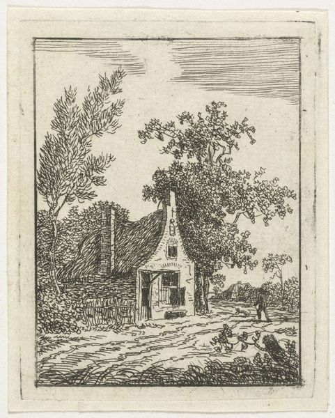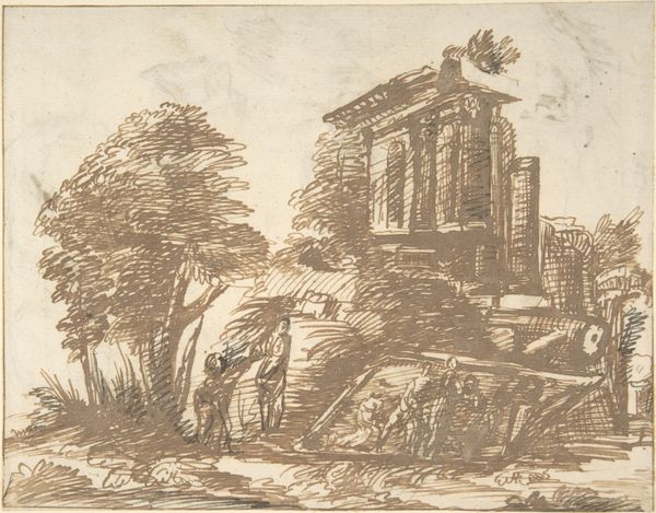 Curator: This etching by Bartholomeus Breenbergh, created around 1639-1640, is titled "Derelict House with a Hexagonal Tower". Editor: It immediately evokes a feeling of melancholy. The detail is remarkable, yet the image itself whispers of decay and forgotten stories. Look how the tower looms, almost skeletal, against what might have once been a vibrant backdrop. Curator: Breenbergh, a pivotal figure in the Dutch Italianate landscape tradition, frequently depicted ruins. His choice to feature decaying architecture wasn’t merely aesthetic; it spoke to the changing socio-political landscape of 17th-century Europe. What narratives are suggested to you? Editor: I'm struck by how these picturesque ruins serve to almost romanticize colonialism. They evoke feelings of nostalgia, but mask the inherent violence related to appropriation and cultural disruption of many locations outside Europe. This piece asks for critical questioning around the allure of a scene of picturesque desolation, inviting dialogue regarding the less savory dimensions of power. Curator: That's a compelling reading. Ruins often signified the transience of power and earthly ambition, fitting neatly within the broader Baroque fascination with vanitas. By showcasing crumbling structures, Breenbergh invites viewers to consider time, loss, and perhaps, a meditation on moral decay? Editor: But what happens if, instead, we use that historical reading to explore whose ambitions are represented? We often see those meditations, the artistic exploration of decline and human frailty. Who is served by only observing the romantic aesthetics, ignoring the structures left behind in favor of what the ruin “represents”? The tower's decline serves more than as a representation of lost power; there's an underlying reality within those walls. Curator: Perhaps Breenbergh's etching can be appreciated both as a poignant memento mori and as an implicit commentary on cultural and power dynamics? The appeal definitely lies in its intricate detailing, like the rendering of the stone texture, and how the architectural details create a vivid illusion of depth within this intimate print. Editor: I agree. By viewing it through both lenses we move past the romantic melancholy and towards more crucial, layered reflections about representation, ownership, and how we engage historical legacies embedded within art. This layered understanding reframes the aesthetics through the politics of existence and memory.