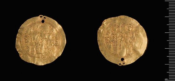Editor: This is a gold Histamenon coin of Constantine X Ducas from Constantinople. It looks like there are figures on both sides. What symbols jump out at you in this piece? Curator: The coin is a powerful symbol of Byzantine authority and religious belief. Notice the figure of Christ on one side. What does it evoke in you? Editor: Holiness, I suppose, but also power. Is that the intent? Curator: Precisely. The emperor, on the other side, seeks to legitimize his rule through association with the divine. The imagery reinforces a hierarchical worldview, embedding cultural memory within a single coin. Editor: I never thought a coin could hold so much meaning. Thank you! Curator: My pleasure. It's amazing how symbols create lasting impact.