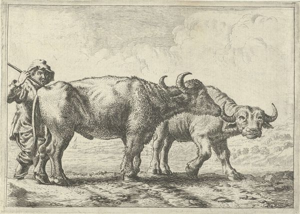 Editor: So, this is "Drie schapen" by Jan Matthias Cok, made sometime between 1735 and 1771. It’s a print – an etching, I think – depicting three sheep in a field. I'm struck by the artist’s use of line; it creates such a tactile sense of wooliness. What stands out to you from a formal perspective? Curator: The strategic employment of line certainly merits attention. Observe the hatching and cross-hatching. It's not merely descriptive, but fundamentally structural. Note how variations in density and direction articulate volume, delineate spatial relationships, and modulate light, guiding the viewer's gaze through a landscape primarily constructed through line and tone rather than color and mass. The relationship between positive and negative space is crucial. Does the simplicity of the composition distract from the intensity of its mark-making? Editor: I wouldn't say "distract," exactly. I think the sparseness of the background actually makes the detail in the sheep stand out even more. You're focusing on these hatching and cross-hatching, is there any kind of traditional pattern that emerges in works like these, like a conventional way to render the coat of a sheep? Curator: Traditional or conventional rendering strategies might provide a foundation. What interests me most is how Cok manipulates this method to construct form. How does he suggest texture and volume within this self-imposed restriction? The degree of variation demonstrates Cok’s skillful formal analysis of light and shadow, transforming simple figures into compelling compositions. Editor: That makes me appreciate the detail so much more, looking at how this technique builds the form from basically just black lines, and considering its overall place in the artwork. Curator: Exactly. By attending closely to the artistic composition of its components, we obtain the richness this deceptively straightforward piece offers.