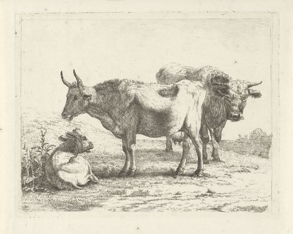 Curator: What strikes you first about this rather peculiar scene? The donkey practically groaning under the weight, maybe? Editor: It’s the absurdity that grabs me. I mean, that poor donkey. He looks resigned to his fate. There's a dark humour at play here. What are we even looking at exactly? Curator: We're observing a pencil and graphite drawing, perhaps even a print, created before 1860 by Martinus Antonius Kuytenbrouwer jr. The title, "Pakezel met dode herten op zijn rug," translates to something like “Pack donkey with dead deer on its back”. Editor: Well, the title doesn't disappoint! It does what it says on the tin. Although, the way those deer are arranged… It’s almost celebratory, morbidly so. Is it meant to be some sort of commentary? Curator: Caricature and genre painting are two of the listed themes here, pointing perhaps toward social commentary, particularly about labour, or hunting culture. Visually, the animal is both burdened and adorned. Deer antlers almost decorate its head. We often load up symbolic weight on animals. Consider images like Atlas carrying the world, images where animal burden reflects a human burden. Editor: True. And there’s something deeply unsettling about seeing death arranged so deliberately. The basket containing one of the deer feels very much staged. This is not some offhand capture; this feels incredibly staged. It's darkly whimsical, in a way that gets under your skin. Curator: It certainly challenges conventional depictions of animals. We expect noble steeds or gentle pastoral scenes. This disrupts those notions, replacing them with something unsettlingly real. The weight of life, the burden of survival...It feels quite modern, in that regard. Editor: Agreed. You expect art to uplift you or transport you but something in its directness does something for me as well. The image and title leave you mulling over things and questioning assumptions about depictions of animals and their purpose or use by humans. Curator: A simple graphite drawing providing endless echoes, then. Editor: Precisely! A somber image but, at the same time, really gets the mental gears turning.