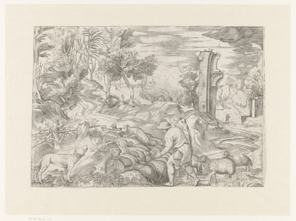 Editor: This is “Reconciliation of Jacob and Esau,” an ink drawing made sometime between 1580 and 1596 by Zacharias Dolendo. It feels very staged to me, like a theatrical performance frozen in time. What stands out to you? Curator: The embrace is key. In reconciliation scenes, embrace is both the emotional climax and a visual metaphor. In this Northern Renaissance engraving, what meanings are embedded in this return to brotherly love? Editor: Meanings? Well, it seems to be the resolution of a conflict. Curator: Indeed. Think about the story. Jacob deceived his blind father, Isaac, to steal Esau’s birthright. What enduring psychological symbolism is captured through this deception? Editor: Perhaps a fractured relationship mended? A rebalancing of power? I am not sure I see any symbols of power... Curator: Look again. Notice the contrast between the two groups behind the embracing figures: Esau’s armed men versus Jacob’s flocks of animals, a pastoral tribe and the army, a contrast that reinforces Esau's initial strength, perhaps also innocence. Does the iconography imply a warning, a historical perspective or aspiration of the time? Editor: So, Jacob’s material wealth isn't just a sign of prosperity; it symbolizes his...victory? Or perhaps Dolendo hints that the power of material gains could be the source of conflicts? Curator: It underscores the shifting dynamics of wealth and power but also offers hope through reconciliation. That’s the compelling thread that ties all these images together. A collective need, even now, perhaps? Editor: That's given me a lot to consider. I now perceive deeper layers in what seemed at first like just a historical depiction. Curator: These works speak across time. Symbols reveal a historical narrative that resonate psychologically even now.