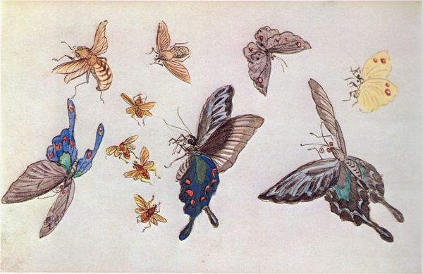Editor: This delicate artwork is entitled "From the Notebooks Mourning for Butterflies," created in 1906 by Fujishima Takeji, rendered in watercolor, gouache, and colored pencil. It feels very fleeting, and makes me wonder about the symbolism of butterflies as representations of mortality. What do you see in this piece, focusing on its visual elements? Curator: From a formalist perspective, observe the considered placement of each butterfly. Note the tension between the central void and the edges of the composition. How do these asymmetrical forms achieve a visual balance? The subtle shifts in tonality across the paper suggest depth, drawing the viewer's eye, yes? Editor: Absolutely. The negative space seems just as important as the butterflies themselves. I am intrigued by how simply the artist captured the essence of each insect. The varying techniques—gouache, watercolor, and pencil—enhance this impression of capturing a transient moment in nature. Does the simplicity speak to something more intentional? Curator: Indeed. The textures generated by each medium contribute to an evocative surface. The composition isn't just representational, it is, dare I say, actively performing its theme. Consider how the lightness of touch mirrors the ephemeral nature of butterflies and memory. The artist’s skillful employment of texture directs our observation to their formal qualities, thus allowing a reflection of nature’s beauty as art itself. What new insight about your immediate response to the work did analysing the form give you? Editor: Seeing how the varied textures are deliberate artistic choices gives me a fresh perspective on the watercolor technique and medium’s capabilities. Curator: Precisely. A keen eye has learned something new today. Editor: Thank you.