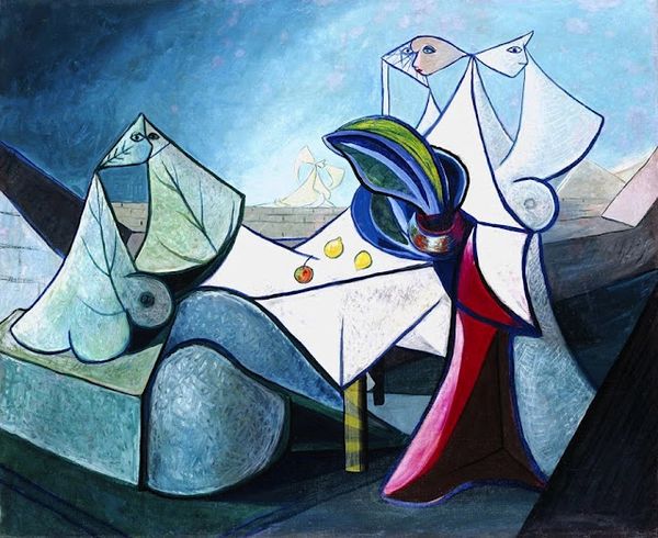 Editor: We are looking at Jules Perahim’s, “La mariée”, which translates to “The Bride”. It's painted in gouache, but its overall composition and placement of elements are just fascinatingly strange. I'm immediately drawn to the three figures—one looks like a bride, one perhaps like a priest, and a strange third, maybe an unexpected wedding guest... What catches your eye? Curator: It is indeed, peculiar. What fascinates me is the pictorial space: a stage where symbolic characters interact. Notice the composition: three figures placed strategically, but not quite touching. This deliberate arrangement suggests a deeper narrative beyond a mere wedding scene. Consider the use of color; the stark contrast of black and white, balanced by muted earth tones, enhances the drama. Can you see how Perahim emphasizes color relationships in place of conventional perspectival cues? Editor: Yes, the contrasting colors create a push and pull on the eye. So much tension and symbolism. Where should I begin to understand it? Curator: Begin with the line; the almost surreal deformation of form is striking. Look at the black figure. Note the dynamic arch of the extended wing-like arm that seems to propel forward, while also creating a containing barrier that sets apart the intimacy between the fish-headed form and bride-like character. Also notice the use of symbolic forms rather than literal figures, can you elaborate on why the artist made these kinds of choices? Editor: Possibly to add greater abstraction, as well as allow the viewer more personal interpretations. So, these are visual devices that work formally rather than narratively? Curator: Precisely. By focusing on shape, colour, and composition, Perahim constructs a visually intriguing image with much semiotic value to decode, resisting simple readings. The bride may not be just a bride; the fish head, not just a fish. These visual devices enrich meaning without resorting to didacticism. What is your ultimate conclusion about this piece? Editor: It's strange, maybe haunting, but intriguing. There’s an intensity in this play with form and color which makes it feel quite charged. Thank you for explaining this approach to understanding Jules Perahim. Curator: And thank you for your insightful observation! The pleasure has been all mine.