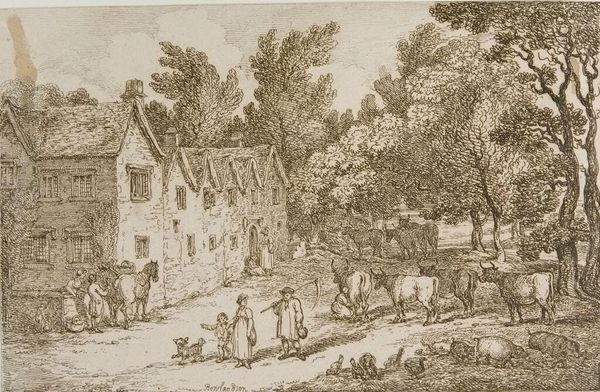 Editor: This is Thomas Rowlandson’s "Village Street," an etching, though we don’t know its exact date. It feels like a snapshot of rural life, but what stands out to you? Curator: Note how the church tower anchors the scene, a stable symbol amidst the bustle. The riders mirror the figures clustered by the cottage, linking movement and stasis. What cultural memories do these repeated elements evoke? Editor: So, these motifs create a sense of familiarity and order? Curator: Precisely. They offer reassurance, connecting the viewer to a shared cultural narrative of village life that has endured for centuries. Seeing it, what might a contemporary viewer have felt? Editor: I guess it’s a reminder that some things remain constant even as society changes. Curator: Indeed, it's about cultural continuity and the symbols that ground us. It’s fascinating how Rowlandson uses these familiar images to create a sense of belonging.