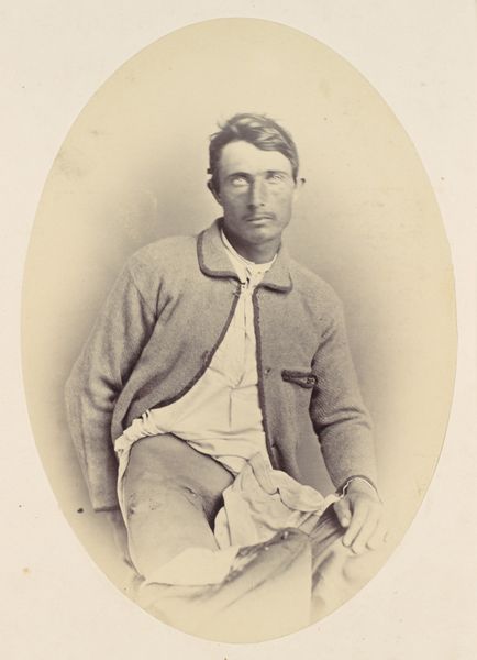 Curator: Up next we have an intriguing photographic piece, a gelatin silver print entitled "Untitled (Portrait of Seated Man with Hat in Lap)." It comes to us from sometime between 1850 and 1899. Editor: The very first thing I see is melancholy; the somber tone almost vibrates off of it. There is something about the gaze, so direct, but also carrying such quiet weariness. And that severely damaged hat—that has definitely seen some years, some wear. Curator: Right. What’s fascinating is the confluence of the burgeoning photographic process and the subject's potential socioeconomic circumstances, don't you think? A somewhat everyday scene elevated. Editor: Definitely. Think about the time and the craft that went into creating just one of these images; it makes you wonder about the hands and the minds that worked to create this moment and this lasting image. The materials used—the gelatin, the silver—were not just components, they were precious in a way that digitized images today just aren't. Curator: It feels almost voyeuristic to gaze into his eyes, frozen in that instant, considering the intimacy between the sitter and photographer. Does his apparent plainness enhance or diminish its worth as art, considering other prevailing social portraitures? It has an unaffected realism to it. Editor: That question hits at the very heart of the supposed schism between art and craft. Who determined a portrait in oils of the wealthy was "high art," but a poignant silver gelatin print such as this could be considered everyday, genre, or craft? This photograph reminds us that every artwork embodies a negotiation of skill, materials, labor, and its consumption by the viewer. Curator: Perhaps what moves me most is what the photograph elides. His eyes don't tell all, of course. A sliver of a past is here, yes, but it’s only ever going to be a glimpse. A question forever hangs, unresolved, like the man suspended between sitting and standing. Editor: Indeed. This makes me reflect upon how every creation embodies human experience, recorded in the labor, the materials and, the consumption. It certainly underscores that a picture can be worth far more than a thousand words.