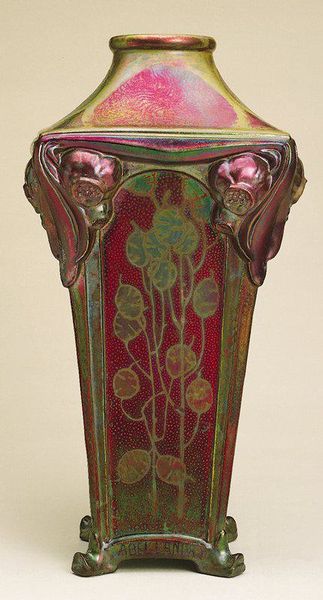 Curator: This umbrella stand, crafted around 1900, is by Friedrich Adler and currently resides here at the Minneapolis Institute of Art. What are your first thoughts? Editor: There's an understated elegance, isn't there? The verticality, the pastel backdrop offsetting the naturalistic details... it creates a sophisticated, yet muted statement. Curator: It's more than just decorative. The piece tells us much about the artistic and social climate at the turn of the century, particularly regarding the blurring lines between the fine and decorative arts, especially within the context of German industrial production. The choice of ceramic, typically associated with craft, elevates the humble umbrella stand. Editor: Precisely! The Art Nouveau style lends itself well to exploring those boundaries. Note how the floral and organic motifs are stylized, almost geometric. The craftsmanship itself is superb; it exemplifies the formal vocabulary of that era so well. The muted green frame contains and enhances the lighter central panel with the flowers and leaves. Curator: Adler’s training at the Kunstgewerbeschule in Hamburg heavily influenced his later designs, pushing for mass production of high-quality craft. His aesthetic considerations, balanced with functionality, would become a signifier for "good design" well into the next century. Editor: Speaking of design, the choice of colors, their relationship—how would you say they affect the viewing experience? It is certainly far removed from earlier decorative arts in palette alone. Curator: Absolutely. The blue of the bellflowers with the deep green structure around them and earth-toned leaves suggest an awareness of contemporary trends beyond Germany as well. These combinations move away from bolder, more saturated colors and into a lighter register of aesthetics and values. Editor: A striking example of form following function—transformed into something far more beautiful. And with such care given to the artistic construction and composition of even a humble umbrella stand. Curator: Yes, by interrogating works such as these, we open ourselves to greater understandings about class, labor, and societal taste through a very tangible object. Editor: Indeed. It underscores the enduring power of art in elevating everyday life—something we should all be reminded of.