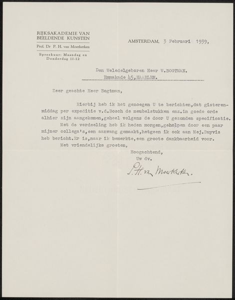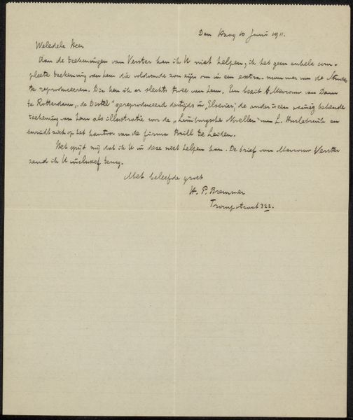 Editor: So, here we have "Brief aan Pieter Haverkorn van Rijsewijk," possibly from 1914, by H.S.J. Maas. It's ink on paper and really showcases calligraphy. It gives a glimpse into a formal era, doesn’t it? The script is just… dense. What meaning do you draw from seeing this visual record of communication? Curator: Indeed. I am immediately drawn to the weight of societal expectations embedded in the carefully constructed script. The very act of committing words to paper in such a formal style—the deliberate strokes, the flourishes—it all speaks to a desire to convey authority and respectability. Look at the official letterhead. Consider the psychological impact of needing to meticulously present oneself in written correspondence during this era. Editor: That makes sense. It seems less about personal expression and more about adhering to societal norms. Do you think the formality limits its expressiveness? Curator: It presents a fascinating tension. While ostensibly rigid, the subtle variations in the script itself—the pressure applied, the connections between letters—hint at the individual behind the facade. Note that the handwriting conveys emotions otherwise hidden. We can see social performance interwoven with personal thoughts. I wonder, does it reveal or conceal more of the self? What did you make of its tone, beyond the visuals? Editor: It feels somewhat bureaucratic, slightly stiff. I see how the artistry of the writing pushes against that feeling. This was clearly more than a simple transaction. Curator: Precisely. The performance *is* the communication, at least partially. By using and interpreting these signals and their context, we acknowledge the shared experience between writer and reader. This is where our memory and our symbols coalesce and allow the creation of cultural meaning to thrive in shared context. Editor: I hadn't thought about it that way – a constructed identity within the social rituals of communication. Thanks!