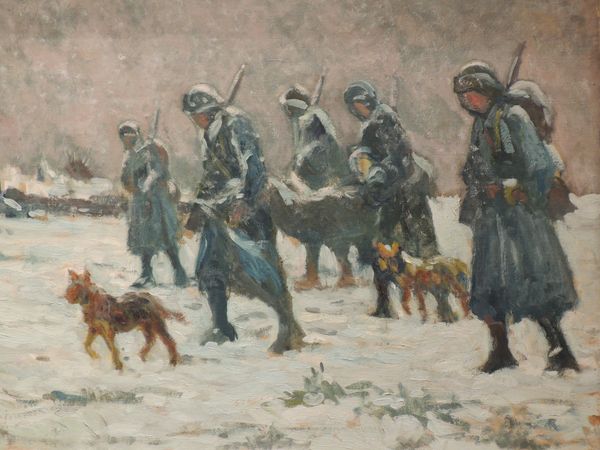 Klavdy Lebedev painted this hunting scene, *Capture of bear in the woods*, with oils, and I’m guessing sometime around the turn of the last century. There’s something really immediate about the way he's captured the scene, like a quick sketch or a snapshot. Look how thin the paint is in the background, almost like watercolor. Then, in the foreground, especially on the red coats, he's built up the paint, making these delicious impasto marks that catch the light. Notice the way he’s used these thick strokes to give shape and form to the hunter on the right, his back turned to us as he hauls the bear. You can almost feel the weight and strain of the capture in that single gesture. I’m reminded of Courbet’s paintings, especially the way he used such physicality in his brushwork. Both artists embrace a way of seeing that feels raw and honest. With Lebedev, there is an understanding that what ends up on the canvas is less about perfection, and more about process.