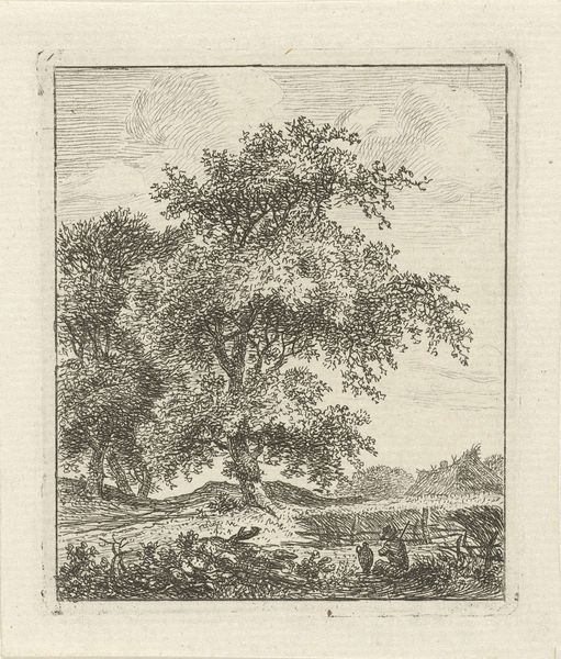 Editor: Here we have Johann Christian Reinhart's "Castell Gandolfo," an etching. I'm struck by the intricacy of the trees and the way the artist uses light and shadow. What can you tell me about it? Curator: Reinhart’s print draws attention to the labor involved in replicating nature through etching. Consider the materials: the copper plate, the acid, the paper, and the skilled hand manipulating them. Do you see how the image presents a constructed, rather than simply observed, landscape? Editor: So, it's not just about the beauty of the scene, but also about the work that goes into creating the image? Curator: Precisely. The print becomes a commodity, and the landscape itself, a subject of ownership and consumption through art. Editor: I see. I never thought of it that way before. Thanks! Curator: My pleasure. It's fascinating to consider how materials and labor shape our perception of art and nature.