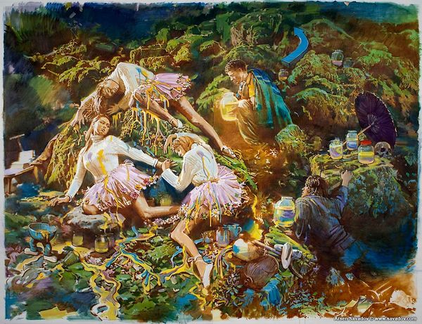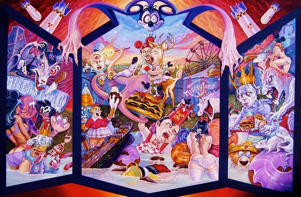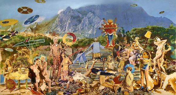 Editor: Here we have Arsen Savadov's 2004 oil on canvas, "Plein Air". It definitely has this dream-like, almost unsettling quality to it. What do you make of the unusual symbolism at play here? Curator: The power of symbolism is central, isn't it? The work, like many fairy tales, reveals our cultural memory. Think about the masks – the rabbit, the tiger. Masks have historically concealed and revealed identities, channeling animalistic powers, and referencing pagan rituals and shamanic practices. Editor: Right, the blurring of human and animal… there’s definitely something primal about that. Curator: Precisely. And the mushroom caps worn as hats – they're not just whimsical; they invoke alchemic transformation. Do you notice how the traditional symbols of putti, are presented as somewhat disquieting figures, disrupting conventional readings of innocence? Editor: That's interesting. They almost seem burdened, not joyous. Curator: They suggest a loss of innocence. And the strategically placed mushrooms--aren't they an age-old symbol of both decay and rebirth? Editor: I see that, the natural cycle... But what about the man in the suit? He looks like he's conducting something. Curator: He might be orchestrating the unfolding drama, inviting us to reconsider accepted narratives and question established systems of power and authority. Editor: So, it's less about the literal "plein air" and more about an internal landscape being revealed through these strange symbols? Curator: Exactly. Savadov compels us to examine the human condition using the shared vocabulary of archetypes, making it a truly unforgettable and unsettling encounter. Editor: That definitely shifts my understanding. Thanks!