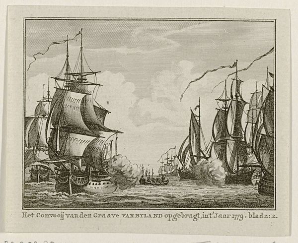 Curator: Before us, we have Yves Marie Le Gouaz's engraving, titled "Jan Bart vaart Duinkerke binnen met de heroverde graanschepen, 1694", made in 1806. It depicts a naval scene, specifically Jan Bart sailing into Dunkirk. Editor: My initial impression is one of intense activity, though rendered with remarkable restraint in this monochrome print. The sheer number of ships creates a powerful sense of bustling, triumphant energy. Curator: Indeed, the composition, though seemingly chaotic at first glance, is carefully orchestrated. The artist's use of line and the stark contrast effectively draw the eye through the mass of ships towards a focal point – though it's less about highlighting one ship and more about the armada itself. There's a semiotic logic at play, presenting a spectacle that reflects power and command. Editor: Beyond the purely visual, the artwork serves as a powerful historical record. Jean Bart's return to Dunkirk wasn't simply about sailing. It signified the reclaiming of vital grain ships, challenging the dominance of France's enemies during a period of intense political strife. These ships ensured food for the people. It's a commentary on access, resistance, and sovereignty. Curator: Certainly, this detail offers layers to understanding the print's resonance beyond a study of line and form. While context reveals narratives of conflict and food supply, the structure is undeniably Baroque – full of implied movement and dense with figures arranged to create a dramatic, compelling image. Editor: I can’t help but consider the perspective from below deck, or perhaps from a family anxiously awaiting those ships. These details enrich the narrative. In essence, this isn’t just an aesthetic document; it's a reflection of power structures, national resilience, and the socio-economic anxieties of the time. Curator: Yes, while different interpretative frameworks shift what we might prioritize, analyzing formal qualities can bring us back to considering affect. Regardless of the specific reading we favor, the artistry is captivating. Editor: Precisely, it’s important to engage with the artwork beyond immediate aesthetics. These images also carry social implications and the echoes of marginalized voices and overlooked perspectives, creating an intricate understanding of our own connections to art history.