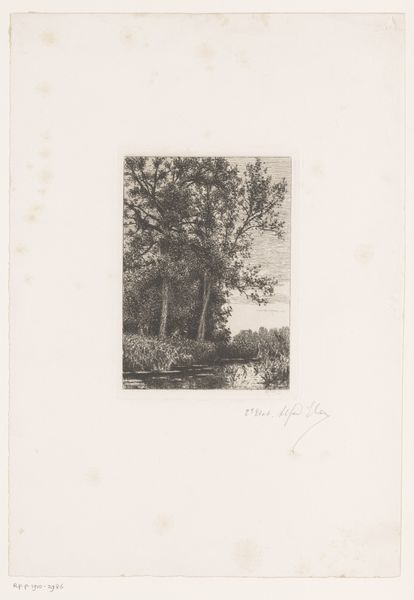 Editor: This is a photograph entitled "Fundering van een jachtslot te Heelsum," placing it sometime between 1890 and 1920, by an anonymous artist, depicting the foundation of a hunting lodge. I find the stillness of the water, reflecting the trees and figures, quite captivating. What do you see in this piece? Curator: What immediately strikes me is the implied tension between the serenity of nature and the assertion of power through architecture. This lodge wasn't just a building; it represented a specific kind of privilege and access to land, usually by wealthy, white landowners. Think about the ecological impact of such structures, then and now, on the land and the displacement such "leisure" entails. Does the artist make any comment? Is there criticism of this? Editor: That's a really interesting perspective. I was mainly focused on the composition and light. I hadn’t considered the socio-political implications. Curator: Exactly. And think about how landscape photography during that time often idealized nature, ignoring or even erasing the realities of land ownership, labor, and class divisions. Who would have benefited, who would have been harmed? Editor: So, it's almost like the photograph, seemingly simple, is participating in a larger narrative of power? Curator: Precisely. It encourages us to ask, who has the ability to build and to photograph such spaces, and whose stories are omitted? Understanding this changes the image. Editor: It definitely does. I see it in a completely new light now. Thanks, this gives a different frame. Curator: Absolutely, questioning those ingrained stories, by making it personal, that's what art is.