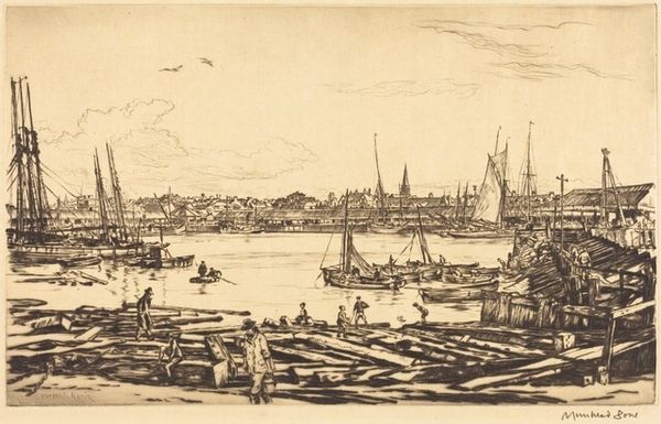 Editor: So, this is James McNeill Whistler’s etching, "The Pool." It's a small print of a busy riverside scene, with a figure in a boat in the foreground. It feels quite intimate, almost like a glimpse into a private moment. What do you make of it? Curator: Ah, Whistler! This piece feels like stepping into one of his dreams. The lines are so delicate, almost a whisper. Notice how he uses the etching needle to suggest, rather than define, form. It’s less about the literal depiction of the scene, and more about capturing a feeling, an atmosphere. What do you feel when you look at the details in the boats? Editor: They feel crammed together, but somehow still peaceful. Like a bustling city seen through a soft lens. Curator: Precisely! Whistler loved to play with perception, to show us the poetry hidden within the everyday. It's a dance between observation and imagination. Editor: I see it now, almost like a memory. Curator: Exactly! It invites us to bring our own stories to the scene.