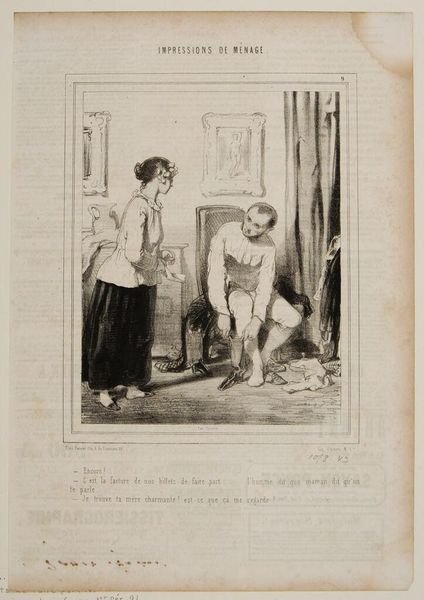 Curator: Honoré Daumier's lithograph, "Mr. Macaire, my dear friend...", presents a darkly comic scene. The print is part of a series satirizing bourgeois society in 19th-century France. Editor: The stark contrast immediately grabs me—the angular lines, almost violently sketched, give the whole piece a frenetic, uneasy energy. Curator: Macaire, a recurring character, is often seen exploiting the vulnerable. His presence here, administering to a suffering figure, suggests commentary on class and predatory behavior. Editor: Semiotically, we see a power dynamic at play; Macaire's upright posture against the patient's contorted form reinforces a clear hierarchy and critique of social structures. Curator: Absolutely. The image resonates with contemporary discussions about economic inequality and social justice—relevant themes when viewing Daumier’s artwork through the lens of today's social issues. Editor: It's interesting how Daumier’s precise use of form serves as a timeless vehicle to reflect on societal issues that still resonate deeply today.