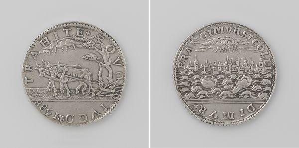Editor: This intriguing silver print, "Ontzet van Leiden" by Dirk Jacobsz, dated 1574, feels incredibly detailed for its scale. The two scenes, both cityscapes, give a strong sense of conflict and resolution. What can you tell me about it? Curator: It’s a fascinating piece when considered in light of its materials. Silver wasn’t just a precious commodity; its very extraction and crafting represented power and investment. Think about the labor involved in minting these engravings! Each strike, each precise line incised, conveys meaning far beyond just the depicted siege. Editor: That’s a good point; the choice of silver seems to elevate it beyond just a commemorative token. It's not just depicting history, but embodying a sense of value, power. How does the medium speak to the historical context? Curator: Absolutely! And the cityscape itself—consider how it was reproduced, distributed, and consumed. The printing process inherently democratized the image, enabling wider viewership. How does that relate to the themes of siege, resistance, and ultimately, liberation, wouldn’t you say? Editor: It seems like this artwork acts as a statement about value, both material and societal, using print to promote ideas of power, success, and accessibility to the population it represents. Is that reading too much into it? Curator: Not at all. The tension between the inherent value of the silver and the accessibility enabled by the printmaking process underscores a key dynamic in Dutch Golden Age society, between opulence and democratization, how power both isolates and manifests unity. What's your biggest take-away here? Editor: Thinking about it not just as an image but also as an object, shaped by material and process, really adds another layer to understanding its cultural significance. Thank you. Curator: Precisely. Looking beyond the image and towards its making enables us to unpack deeper layers of social meaning in art, reflecting historical values, consumption, and the dynamic between material and labor.