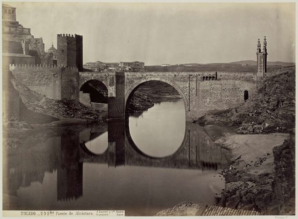 Curator: This gelatin silver print captures the Ponte de Nomentano, dating from the 1860s, by Gioacchino Altobelli. I’m immediately struck by the ruined texture of the stonework. It speaks of centuries of wear. Editor: It has such an evocative, almost romantic feel, despite being a photograph of a very real, utilitarian structure. Look at the stillness of the water mirroring the bridge. There's a serenity there, and also a sense of history. Curator: Absolutely. Notice the strategic positioning of the figures at the base; Altobelli contrasts human labor and leisurely assembly against the immemorial architecture. The photograph transforms into a commentary about how we occupy, interact, and impact places like this through use and time. The horse-drawn carriage on top is also worth noting, an element of relatively modern commerce contrasting against the older stones. Editor: And the bridge itself is such a potent symbol—literally a passage, but also representing the connection between different eras, different powers. Consider all the travelers who have crossed that point, all the stories that it has silently witnessed! The eye is really drawn to that central arched opening. Curator: Indeed. I'm captivated by the layers of materiality evident. The rough-hewn stones against the water, and how light plays upon these surfaces through the early photographic printing processes of the era. It brings forth considerations about craft—about how our interactions sculpt materials through a dialectic exchange. How each small addition to its infrastructure became a historical marker itself. Editor: Seeing those figures reminds us that history isn't just about stones and empires. The people are crucial, engaging directly with symbolic significance. Their mere presence along this symbolic threshold contributes to its meaning, its continuity. Curator: Precisely. The image is also speaking to the evolution of that relationship as the horse carriage above exemplifies changes of commerce. But both are part of the labor and transport. The decay, then, makes a visual statement. Its fractured surface reveals an active negotiation between different forces instead of stasis in history, society and environment, while the landscape is subdued around the image's focus. Editor: Looking closely has opened a deeper understanding of how bridges function as both connectors and powerful reminders of transition—across time, space, and cultural narratives. Curator: And for me, examining the methods used to craft the bridge as a symbolic, material structure in this photo only intensifies the meaning. Altobelli has documented not just a bridge but an idea, the idea of change manifested materially.