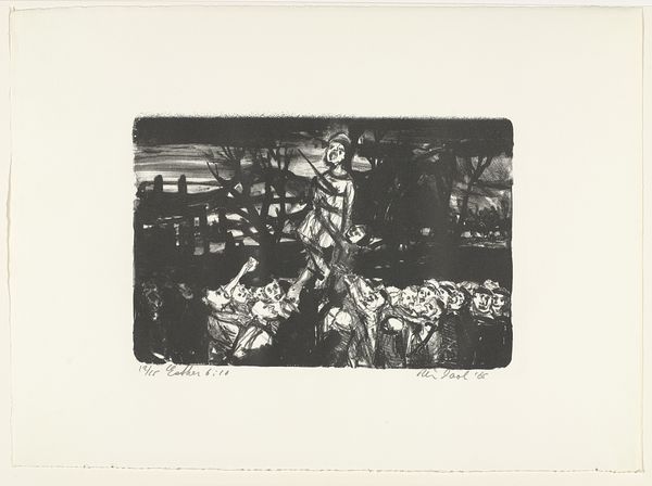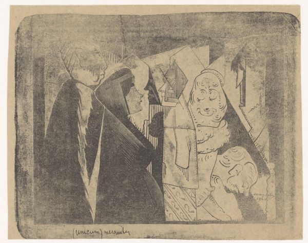Editor: This print, "Two Groups of Figures with their Backs to Each Other" by Samuel Jessurun de Mesquita, created in 1924, is captivating. It’s a study in contrasts, black and white graphite creating two distinct clusters of people, seemingly disconnected. What structural elements stand out to you? Curator: The immediate element of interest is the bifurcated composition itself. Observe how the picture plane is cleaved almost perfectly in twain. The visual rhyme of figures looking in opposing directions sets up a powerful structural dichotomy. Editor: Yes, and there's a noticeable difference in the rendering of each group. One is more detailed with defined lines, and the other seems almost unfinished. Does that asymmetry suggest anything significant to you? Curator: Consider the lines themselves, their weight, their direction. Are they gestural or descriptive? Note the heavy, almost brutal hatching in the group facing right. Conversely, observe the more delicate, linear approach used for the figures facing left. These variations articulate space. Editor: That makes sense. And how do those differences impact the overall reading of the work? Curator: By denying a uniform approach to both sets of figures, de Mesquita avoids any simplistic reading. He asks us to consider each grouping through discrete aesthetic criteria. It allows for no blending of affect between each side, thereby ensuring a compositional tension. The negative space dividing the masses allows us to focus on tone and construction within each individual picture plane. Editor: That’s a perspective I hadn't fully appreciated. The intentional lack of uniformity really elevates the work beyond a simple portrait. Curator: Exactly. Art isn’t only about subject matter. A formalist interpretation insists we rigorously examine structure first. It often shows a whole new perspective.