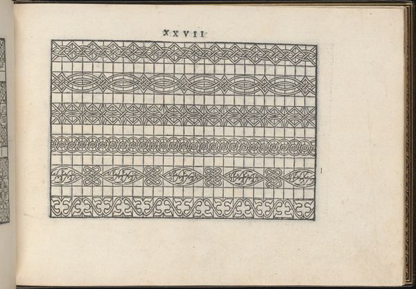 Curator: This page comes from Giovanni Ostaus’s “La Vera Perfettione del Disegno di varie sorti di recami,” specifically page 20 recto, published in 1567. It's an engraving, part of a series intended as patterns for embroidery and lace making. Editor: Intricate! At first glance, I’m seeing a beautifully contained geometry. The lines are so clean, but they lead to these organic, almost flowing forms... restrained nature, perhaps? Curator: I think that’s spot on. Renaissance embroidery was not just decorative; it was deeply symbolic. Patterns like these, based on geometric structures, referenced classical ideals of order and harmony that defined the era’s worldview. The grid suggests rationality, while the interwoven floral designs add an element of earthly delight. Editor: Exactly! And I immediately wonder about the role of women during this time period, as well. I understand this sort of art form offered one potential route to agency through creativity and labor, in times and locations where their influence might be constrained. The Italian Renaissance, yes, was largely patriarchal. Curator: Indeed. Consider too, the reproductive aspect of this print: its function was to disseminate patterns to enable other makers to create and further interpret them. So, although the original designs came from Ostaus, its execution lies with countless unnamed women artisans across Europe who took up the needle and thread. Editor: Fascinating. It makes me think about the intersections of craft, gendered labor, and the accessibility—or inaccessibility—of art production during this period. To me, this page reflects both the beauty of a structured society and its undercurrents of creativity seeking an outlet, finding it in the intricate details of daily life. I see something defiant in all this... a silent conversation about aesthetics, skill, and purpose that reaches across centuries. Curator: I agree wholeheartedly! It’s a powerful reminder that sometimes, the most resonant art comes from unexpected places, speaking to us in a visual language as fresh today as it was back in the sixteenth century.