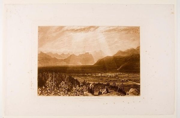 Editor: This is J.M.W. Turner's "Chain of the Alps from Grenoble to Chamberi." It's a print, and the way the light filters through the clouds and illuminates the valley is quite striking. What can you tell me about this piece? Curator: Turner was deeply interested in how landscape paintings could convey the sublime. How might his rendering of the Alps reflect the rising industrialization and urbanization in England? Editor: Perhaps this is a romantic counterpoint, finding solace in the grandeur of nature. Curator: Exactly. The figures in the foreground seem almost dwarfed by the landscape, suggesting nature's dominance over human affairs, especially in a time of rapid change. Consider the social implications of romanticizing nature at this moment. Editor: So, it's not just a pretty picture, but a statement about society's relationship with the environment? Curator: Precisely. It encourages us to think critically about how art reflects and shapes our understanding of the world around us. Editor: I see now. Thanks, that's really helpful!