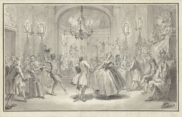 Editor: Here we have "Gewapende heren in een vertrek," or "Armed Gentlemen in a Room," created sometime between 1722 and 1784 by Simon Fokke. It’s an engraving. It’s a very intricate composition, almost like a stage setting, but I’m curious what strikes you most about the piece? Curator: Immediately, it's the emphasis on line and the sophisticated management of light and shadow. Observe how the artist uses hatching and cross-hatching to create tonal variations and give form to the figures and the architectural details. Do you see how the composition is constructed through a series of receding planes? Editor: Yes, the eye is led back by the decreasing scale and detail. The chandelier is a nice focal point to punctuate the space! Curator: Indeed. Also, the formal qualities of the line itself, both delicate and precise, guide our eye across the surface. Consider the almost mathematical rigor with which Fokke constructs the perspective, organizing every figure and object in relation to one another. Does this mathematical element contribute to the reading of space, in your opinion? Editor: Absolutely. There is depth. It almost seems like he's building depth through the linework itself, varying the thickness and density. The closest objects have denser lines and greater visual weight. Curator: Precisely. This meticulous rendering technique invites us to examine not merely the subject, but the formal devices at play. Editor: That's interesting. I wouldn't have noticed these visual patterns so readily on my own. Curator: Close observation unveils not just the “what” but the “how”— the language, if you will, through which the artist communicates, and consequently reveals meaning. I do enjoy exploring these structures in Baroque engravings and paintings.