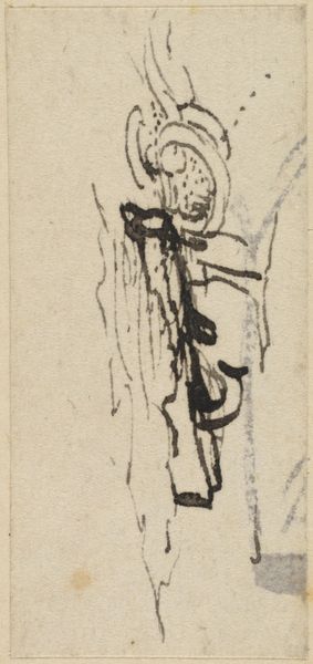 Editor: This is a quick sketch, titled "A Padlock," by Sir David Wilkie, made with pencil and ink. The thing that immediately jumps out is how minimal the rendering is; despite that, it really manages to convey the object’s form and, in some sense, its weight. How would you interpret this drawing? Curator: Notice first the confident linearity. The structural elements are boldly declared. Consider how the hatching around the object, the wood grain perhaps, plays with the relative starkness of the padlock itself. Wilkie isn't concerned with illusionism, but rather, he is accentuating the fundamental visual components. Do you observe how the positive and negative spaces interact to construct the image? Editor: Yes, the way the negative space kind of carves out the shape of the lock itself. So, is the focus simply on these basic artistic components, line, form, space? Curator: Precisely. It's about appreciating the internal relationships. The pencil and ink serve to define the object's physical being on the page, while the visible linework emphasizes artistic construction, devoid of narrative content. Note the modulation of line weight—this directs the viewer’s eye to different planes. Editor: It’s interesting how such a simple sketch can reveal so much about formal artistic intention. I’m so used to thinking about narrative that I usually skip over how line weight and negative space influence my perceptions. Curator: The material and its execution give us all we need to engage with it. Looking closely at the composition reveals the intentionality behind the simplest of subjects. Editor: It's definitely a good reminder to slow down and really *see* what’s on the page. Thanks!