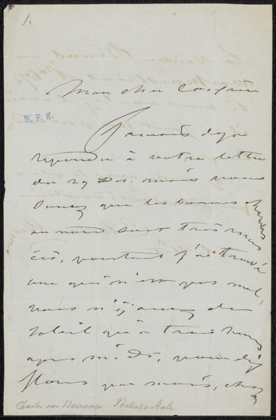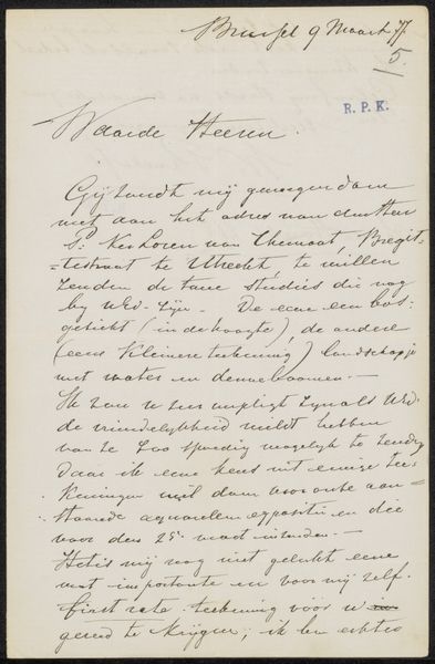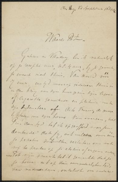 Curator: Up next is Henri Fantin-Latour's "Brief aan Philip Zilcken," likely composed between 1891 and 1897. What's striking about this work? Editor: Immediately, it's the intimacy, isn't it? It feels like an intrusion, in the best way. The handwritten letter, the personal note - it invites us into a private exchange. Curator: Precisely. This ink on paper drawing provides an example of Fantin-Latour’s social and artistic networks. He penned this missive to Philip Zilcken, a key figure in the art world. It highlights how art unfolds not in a vacuum, but through layers of personal and professional exchanges. Editor: Absolutely, it contextualizes the role of these figures within the larger discourse of late 19th-century art. Were letters common forms of artwork then, almost like pen-ink performance pieces of their time? Curator: You've hit on a key aspect. Epistolary exchanges formed critical conduits for discussing art, arranging exhibitions, and shaping critical opinion. Think of how art circulated then compared to today. Editor: So this "letter" isn't just about content; it is about process and the politics of access. What's being communicated also pertains to who is doing the communication. Who did Fantin-Latour include and exclude through letters such as these? Curator: Exactly. We get to consider the art world's inner workings through seemingly simple lines and sketches, hand lettering reminiscent of calligraphy that hearken back to romantic traditions. Note the flourishes. They signal purpose and also aesthetic sensibilities. Editor: The way Fantin-Latour crafts language, here. It evokes the cultural norms around how communication functions and looks. Are certain scripts more valued? Or certain types of stationary or hand writing? To whom is Fantin-Latour signalling class, distinction, access, or intention? Curator: All that's definitely implied, especially in relation to the status and role of an established critic. So this unassuming document then becomes a stage for navigating social roles and power relations within the art establishment. Editor: I never imagined a quick sketch could tell such a nuanced story. Curator: Indeed. Fantin-Latour provides such a vivid glimpse into the socio-political web that propelled artistic movements of the period. Editor: Thinking about that context makes this feel like more than just a letter now, more like an intentional piece.