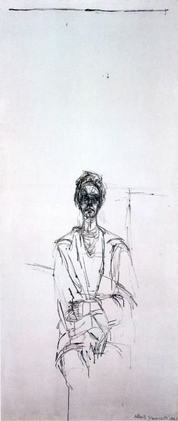 Curator: Alberto Giacometti’s "Caroline" at the Tate is striking—her face is almost a blue mask. The rest rendered in thin, scratchy lines. Editor: And there's a real rawness to those lines, isn't there? You see the making so clearly. I wonder, what kind of paper is this and how did he prepare it? Curator: It’s as if he's trying to capture not just her appearance, but the very fleeting essence of her presence, the weight of being… Editor: I see what you mean. It's like the image is barely held together; the work itself embodies a kind of precarity that speaks to the existential themes Giacometti explored. Curator: It feels so intensely personal, almost as if he's wrestling with the canvas itself. Editor: Right, and you know, thinking about the materials, it makes you wonder about the economy of art-making. Curator: A dance with the void, perhaps. Editor: Exactly. It’s there to see in the work, if you look.