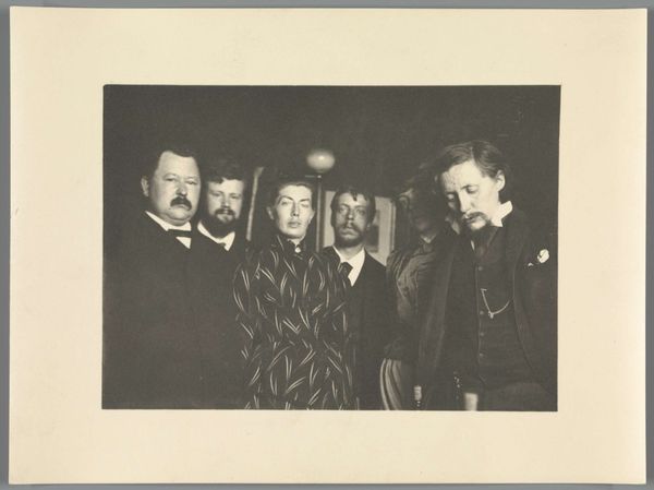 Curator: This intriguing image, "Three men--San Francisco," is a photograph by Robert Frank, captured in 1956. The print has an undeniably grainy, immediate quality. Editor: There's a stark, almost confrontational mood to it, isn't there? The harsh light emphasizes every line on their faces. It's a strong compositional piece. Curator: Absolutely. Notice how each man seems to embody a different aspect of the mid-20th-century American persona. The first has an almost rugged, outdoorsy archetype about him, reflected in his western-style shirt, contrasted sharply by the clean attire of the third. Editor: It's fascinating how Frank plays with texture. The plaid shirts against the somber dark jackets, all contrasted against the seemingly blank wall – the composition speaks to different classes or mindsets within that society. The framing of each individual creates tension. Curator: Indeed. This contrast evokes themes of cultural stratification. They're separated, yet together, seemingly sharing a space while retaining individual narratives. Frank often depicted marginalized or overlooked individuals and places. They look almost defiant. Editor: I'm intrigued by how they all share hats in common— head coverings usually signal roles or affiliations. This echoes how clothing helps reinforce character throughout, with color used as one the main contrasting tools. Curator: You bring up an excellent point about clothing! By emphasizing subtle, and sometimes bold elements of clothing within a single photograph he explores commonness, identity and subtle forms of individualism. Editor: These small details, captured with clarity, invite a deep dive, as though we are peeking through some moment from history Curator: This photographic snapshot serves as a powerful reflection on culture during post-war America, questioning ideas of belonging and social constructs. Editor: Well, I'm seeing many facets reflected here, both literally and figuratively. A composition frozen from history for us to dissect further.