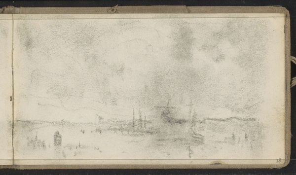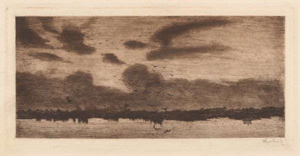 Editor: So, this is Félix Buhot's "The Spirits of Dead Cities," and it’s at the Harvard Art Museums. Looking at this print, I immediately feel this sense of melancholy, like a dreamscape fading into memory. What do you see in this piece? Curator: Melancholy is a good word. For me, this print whispers stories of forgotten places, lost to time and perhaps conflict. Buhot evokes a world layered with history, seen in the sky and reflected on the ground. Notice how the sky seems heavy, almost oppressive? Editor: Yes, and there’s a strange bird flying low. Is it a symbol of something? Curator: It could be. Birds often represent freedom or a messenger, but in this context, I see it more as a soul navigating this spectral landscape. The entire image feels ephemeral, doesn't it? Like a fleeting glimpse of what once was. Editor: It really does. It makes you think about what’s been lost. Thanks, that gives me a lot to consider. Curator: My pleasure. It’s a piece that invites contemplation, isn’t it?