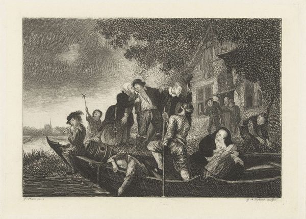Curator: This is Joseph Andrews’s "Plymouth Rock, 1620," a steel engraving that captures a pivotal moment in American history. Editor: The dramatic lighting and the expressions of hardship immediately strike me. It's a very romanticized, almost theatrical take, isn't it? Curator: Indeed. It reflects the 19th-century fascination with the Pilgrims as founders. Andrews’s work helps shape our understanding of the narratives of colonialism. Editor: And what about the indigenous perspective? This image erases their presence and agency. The image romanticizes colonization, obscuring the violence it unleashed. Curator: Absolutely. It serves as a reminder of the power of images in shaping historical narratives and national identities. Editor: A powerful, though troubling, piece when viewed through a contemporary lens. Curator: It highlights the importance of critically examining historical representation.