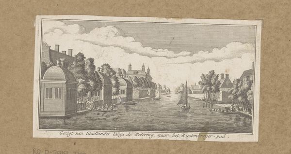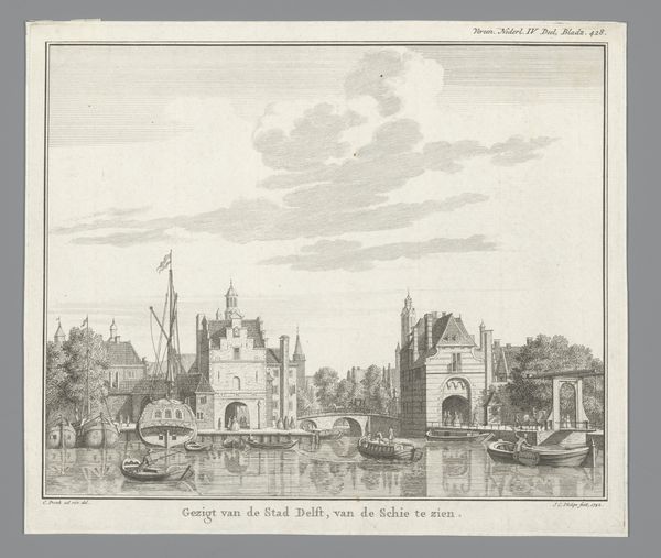 Curator: This etching, "View from the End of the Overtoom by the Leidse Veerhuis" dates from between 1725 and 1764 and is attributed to Gerardus Condet. It's currently held in the Rijksmuseum. Editor: It’s charming, though a bit austere at first glance. The delicate lines create a placid, almost dreamlike atmosphere. I find myself wondering about the daily routines captured here. Curator: Absolutely. Waterways as arteries of trade, of connection. Think about the Golden Age symbolism embedded in a view like this—prosperity, progress, but also the precarious nature of wealth, all riding on these ships. Editor: Yes, and the materiality of it—the ink on paper, of course, but also the textures of the buildings rendered with such precision. The way he suggests the rough-hewn timber of the houses and loading areas, likely constructed with great manual labor, really speaks to the social and economic fabric of the time. Curator: The octagonal building—likely some sort of merchant’s pavilion. In this era of nascent capitalism, this architectural form appears so frequently; each one becomes a symbolic locus of financial calculation. And that carriage—a status marker but also a suggestion of trade and travel, of moving goods and people through space. Editor: And barrels are being moved – materials transformed and transported for trade, supporting the local economy! The workers visible in the scene underscore that element of labor rarely given such clear visual expression in the art of the Dutch Golden Age. Curator: It also makes me think of memory. These visual representations create and preserve a cultural understanding and memory of Amsterdam, not just as a place but as a living, breathing entity engaged in trade and society. Editor: Exactly. The artwork makes visible the everyday realities upon which that golden age was built. It also serves as an excellent reminder that "art" is equally made by labor and that both exist intertwined! Curator: Thank you. It enriches our appreciation of not just what we see, but the unseen, yet no less vital, systems at play. Editor: Indeed. By considering its material circumstances and the social realities they reflect, we grasp a bit more fully how it all came together.