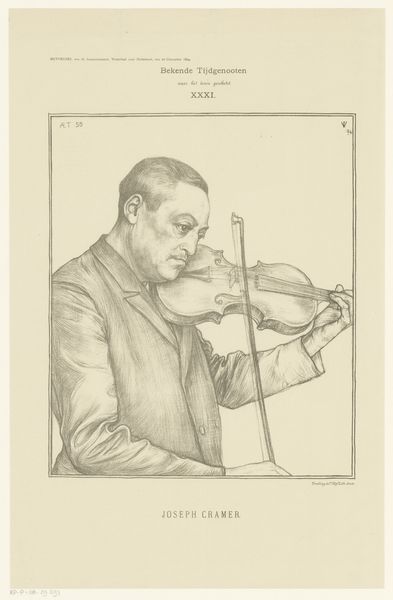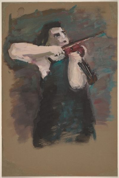 Curator: Up next is Cyprián Majerník’s "Bullock," created in 1936. It is painted using watercolors and is also recognized as a charcoal drawing and oil painting portrait, which is rather striking to look at. Editor: It's quite striking indeed, though somewhat subdued in its color palette. The brushwork feels hurried, capturing a momentary pose. It projects a kind of melancholy; the musician seems utterly absorbed, almost lost in his playing. Curator: The subject’s working-class appearance challenges traditional portraiture's focus on the elite. The violinist here doesn’t present himself, the material object of the violin is more important to express what this man might feel through art. Majerník, especially at this time, was influenced by the grim economic conditions which likely affected his artistic choices and subject matter. Editor: Precisely. We must consider not just the artist’s intention, but also the social function of the piece, for the lower class and for social commentary. Curator: Considering that art production is also a form of labor. Majerník’s choice of less precious media such as charcoal drawing also suggests making art during less than ideal studio conditions. Editor: Right, you notice that even the material support—likely paper—looks rather raw, almost unfinished. It all comes together, pointing to constraints and the available. How materials impact content. Curator: And how the economic situation of that time deeply impact the means and subject of production for artists and craftspeople. But on another level, even considering portraiture norms, depicting ordinary folks offered them visibility and acknowledgement in art and visual culture. Editor: Certainly, that challenges the existing visual hierarchies by providing an image to rally under. It is not just the aesthetic depiction, but a document that opens paths for future interpretations and discussions about societal values. Curator: Yes, that helps provide some understanding to his intent of subject choice and representation of the person through the art made available during those years of creating art in grim economic times. Editor: Ultimately, I'd suggest the focus be placed on this relationship of production: artist/material, sitter/social circumstances, and painting/society, to comprehend "Bullock."
