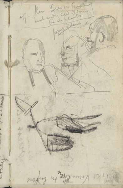 George Hendrik Breitner made this study sheet with heads using graphite on paper, likely in the late 19th or early 20th century. The graphite, a relatively soft and easily manipulated material, allowed Breitner to quickly capture the nuances of light and shadow on the faces. The immediacy of graphite lends a sense of intimacy to these studies. The choice of paper as a ground is equally significant; its texture and absorbency affect how the graphite is laid down, contributing to the overall tonality of the sketches. These materials were easily accessible, and they suited the rapid, iterative nature of study. The production of such a sheet underscores the intense labor involved in artistic training, reflecting the academic practices that emphasize observation, repetition, and refinement. By valuing these processes, we recognize the skill and effort invested in creating what might otherwise be dismissed as a preliminary work.