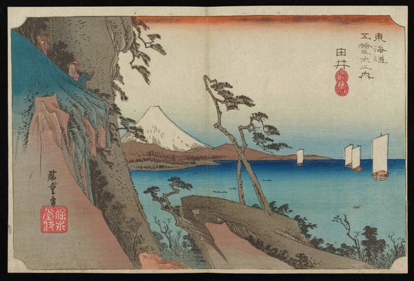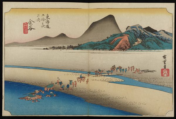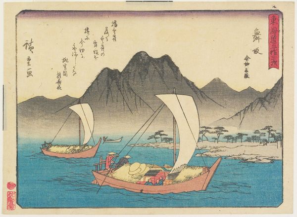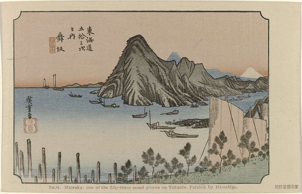 This print, *Maisaka--Real View of Imagiri*, was made by Utagawa Hiroshige using woodblock printing, a method known as *ukiyo-e*. The character of the wood is crucial here. A keyblock was carved first, defining the image, and then other blocks were made for each color. Because the wood can only yield so many clear impressions before wearing down, these prints were truly democratic objects, produced in large numbers for a broad public. Notice the flat planes of color, and how the grain of the wood subtly appears. The success of this print depended on the close collaboration between the artist, the block carver, and the printer, each a specialist in their own right. Far from a unique creation, *ukiyo-e* prints like this one were made to be widely enjoyed, connecting the populace to iconic landscapes, and to each other. The rich hues and delicate lines are a testament to the deep traditions of craftsmanship and the culture of printmaking in Japan.