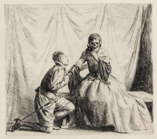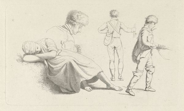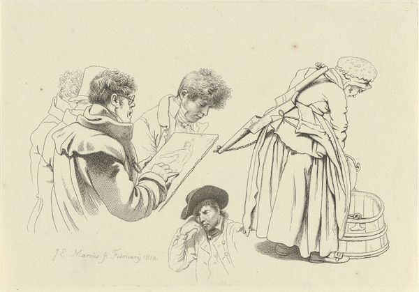 This study sheet with figures was rendered in ink by Jacob Ernst Marcus in November 1808. Notice how the composition is divided into distinct vignettes, each showcasing figures with a range of gestures and poses, all sketched with precise lines and delicate shading. The artist's formalism gives us insight into his study of human form and expression. The figures, though seemingly disparate, are connected through a common artistic lens, revealing Marcus's interest in capturing fleeting moments of everyday life. Through careful observation and rendering, each figure is imbued with a sense of individuality and character, inviting viewers to construct their own narratives and interpretations. Note that the interplay of light and shadow, achieved through subtle gradations of ink, adds depth and dimension to the composition. This piece underscores the artist's technical skill and his exploration of the human condition through the language of drawing.