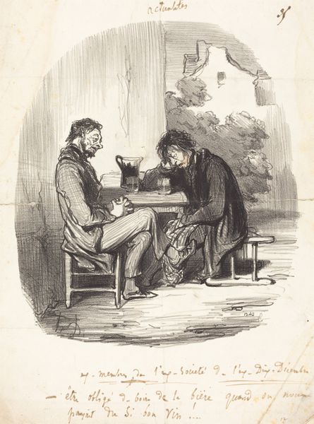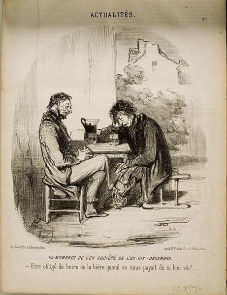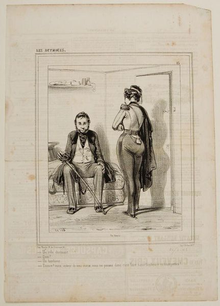 Editor: This print, by Paul Gavarni, is titled "A six!... Qui est-ce qui excompte à six?..." It depicts two men, one at a desk and the other standing behind him. It feels very critical. What societal commentary do you see in this piece? Curator: The print likely critiques financial practices and social inequalities of 19th-century France. Consider the implications of usury and who benefits from such systems, and who is exploited. The text hints at themes of mistrust and perhaps predatory lending. Who holds the power in this image? Editor: The standing man seems to have more power. I had not considered the implications of the title relating to usury. Curator: Exactly. Gavarni uses satire to expose uncomfortable truths about social hierarchies and economic exploitation. Does it make you think differently about it now? Editor: Definitely. It's a powerful look into 19th century social issues. Curator: Agreed. Art can be a powerful tool for activism and societal change.