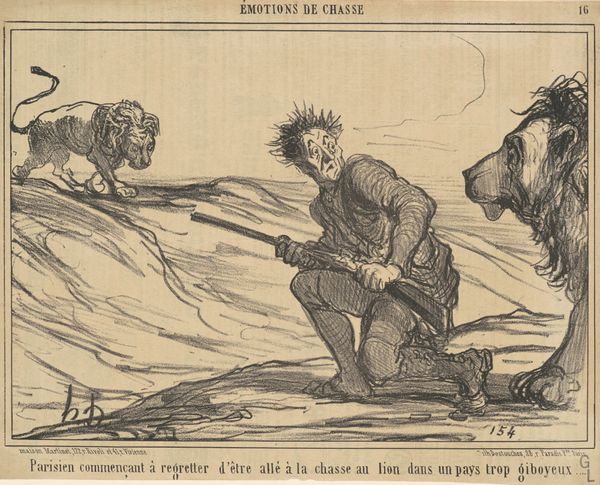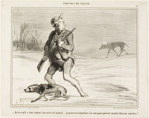 Curator: This is Honoré Daumier's lithograph, titled "Why is he always following me, that animal..." It resides here at the Harvard Art Museums. Editor: The stark contrast between the figure and the desolate landscape immediately strikes me. A palpable sense of isolation emanates from this print. Curator: Daumier's use of lithography allows for incredibly nuanced tonal gradations, accentuating the man's weary posture and the disturbing presence of those animals. Editor: Consider, too, the labor required to produce such a print. Each line, etched meticulously into the stone, speaks to the accessibility of image production and its dissemination among the populace. Curator: The man’s turned back and the text beneath invite us to consider his psychological state in relation to the ominous figures. Editor: This piece reveals the societal structures that made such a scene—hunter versus hunted, man versus beast—both possible and, perhaps, inevitable. Curator: Indeed, a perfect reflection of human anxieties of the period, distilled through Daumier's sharp eye. Editor: Yes, and perhaps also a comment on our strained relationship with the natural world, even now.